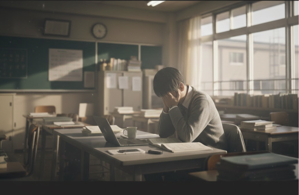 「自分がおかしいのか」と寂しくなる。 - 夜の職員室でふと立ち止まる。このままでいいのかと、削られていくような違和感。