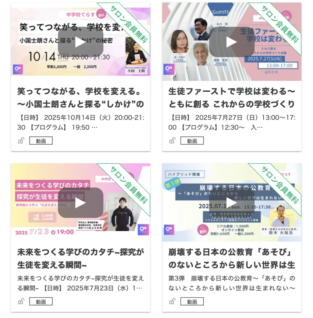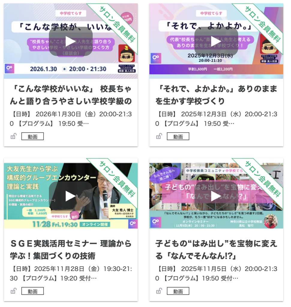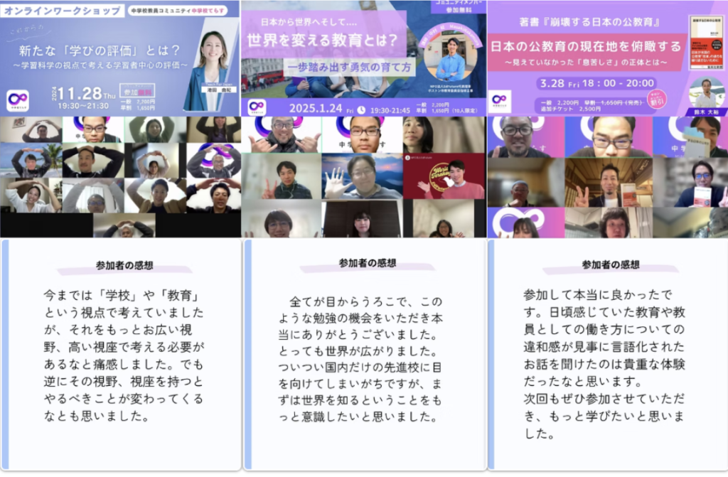 毎月1〜2度、教育現場の第一線で活躍する講師を招いたオンラインイベントを開催しています。最新の教育トピックや実践的な指導法を直接学び、アップデートできる貴重な機会です。