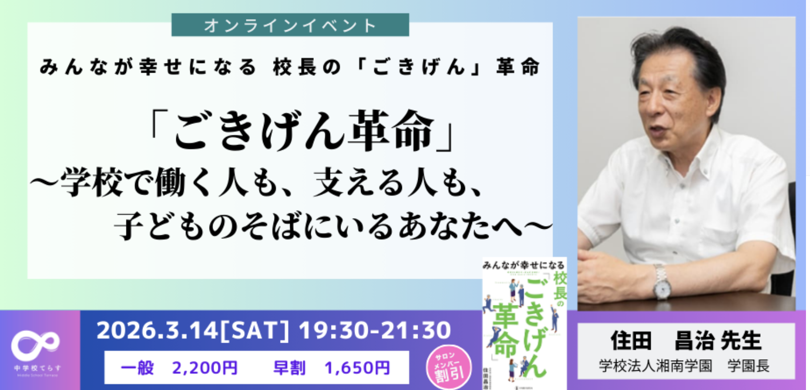 学校法人湘南学園学園長の住田昌治先生をお招きし、オンラインイベントを開催しました。全国から「学校を、そして自分を幸せにしたい」と願う熱心な先生方にお集まりいただきました。